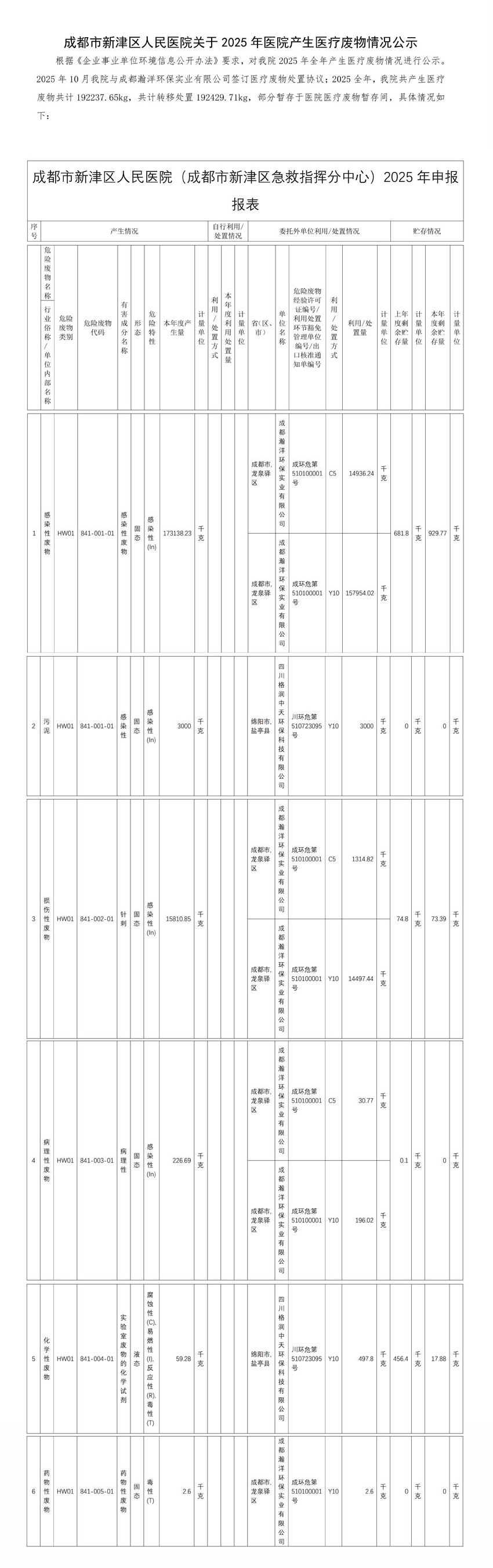 成都市新津区人民医院关于2025年医院产生医疗废物情况公示