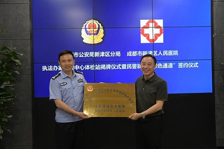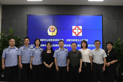 7月12日,成都市公安局新津分局执法办案中心体检站揭牌仪式暨民警就医“绿色通道”签约仪式在分局执法办案中心举行。成都市公安局新津区分局党委副书记、政委张科,区卫健局党组成员、副局长蒋春,区人民医院党委书记刘洲等参加仪式。
